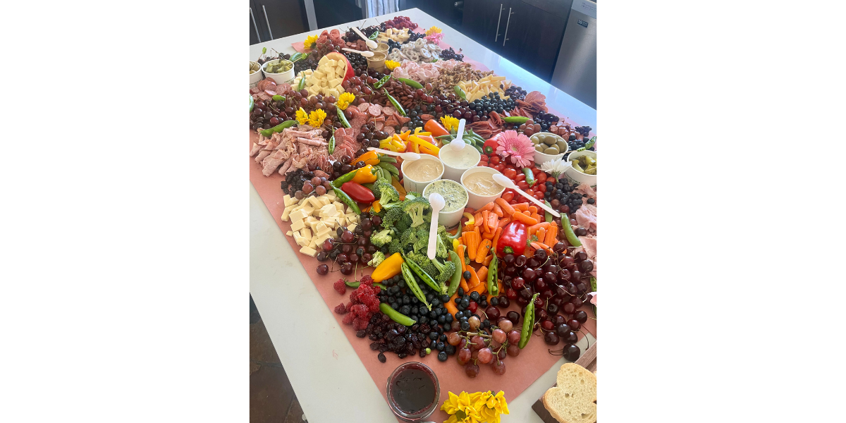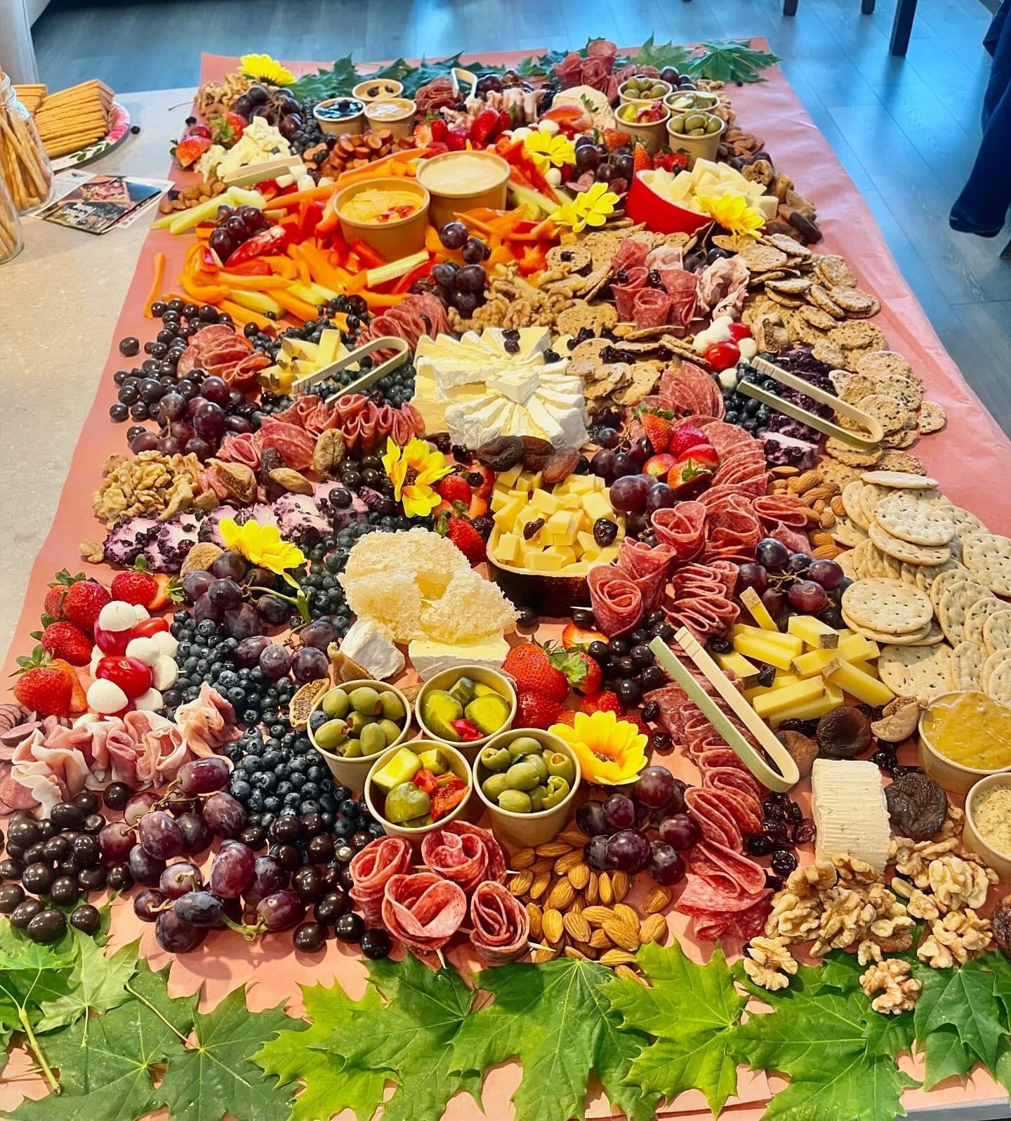 My grazing tables are one-of-a-kind edible art, guaranteed to create a 'wow' moment for you and your guests. I always use fresh, local, seasonal produce whenever possible, and a wide range of tasty cheeses, charcuterie, briny olives, pickles, salty snacks, fresh-baked breads, crisp crackers, seasonal fruits, dips, zingy mustards, and sweet fruit compôtes.