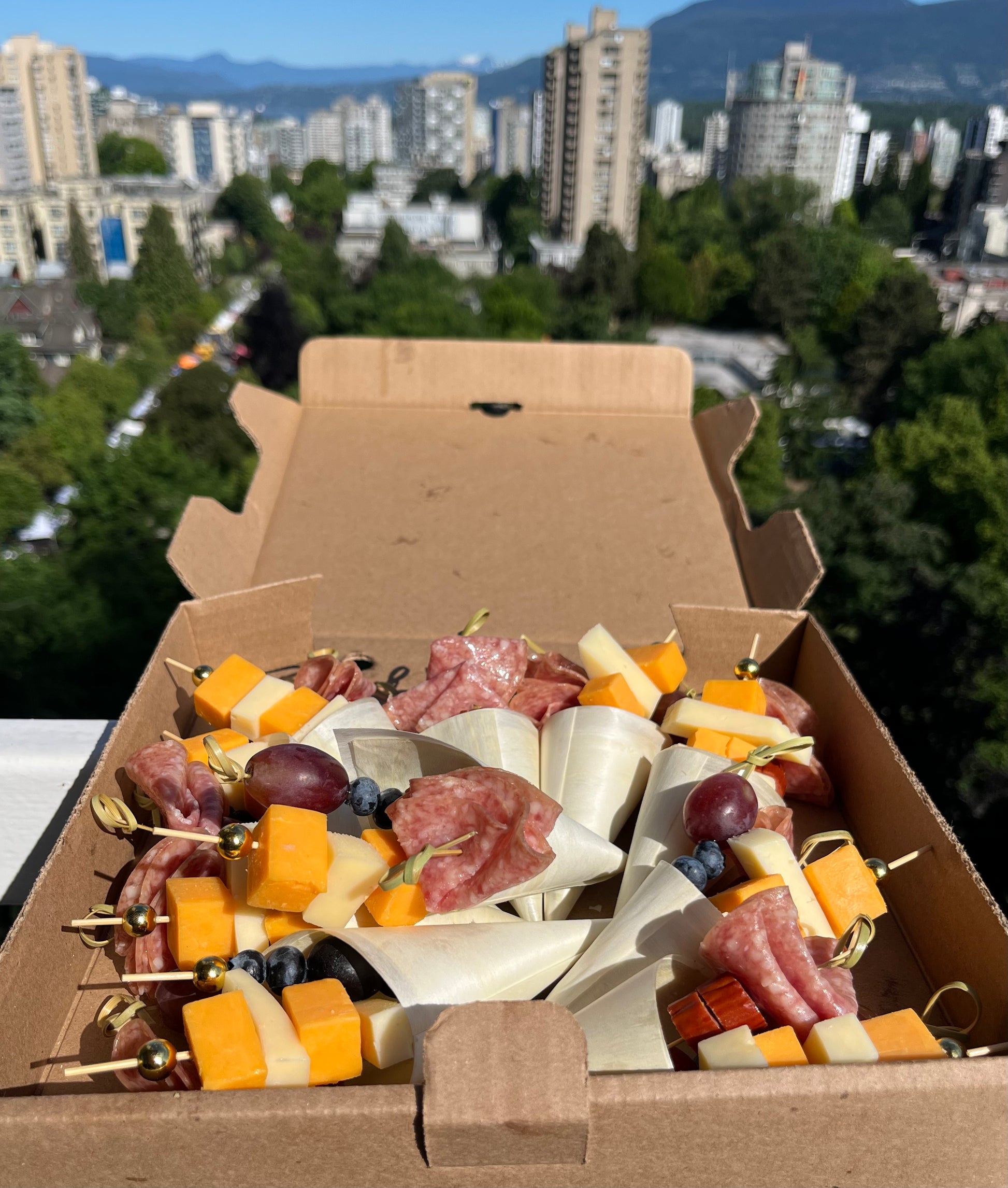 Putting the CUTE into Charcuterie, each cone has chocolate and dried fruit in the base, and a charcuterie, cheese and fresh fruit skewer. Fully customizable, I can make them vegetarian, vegan or GF on request.