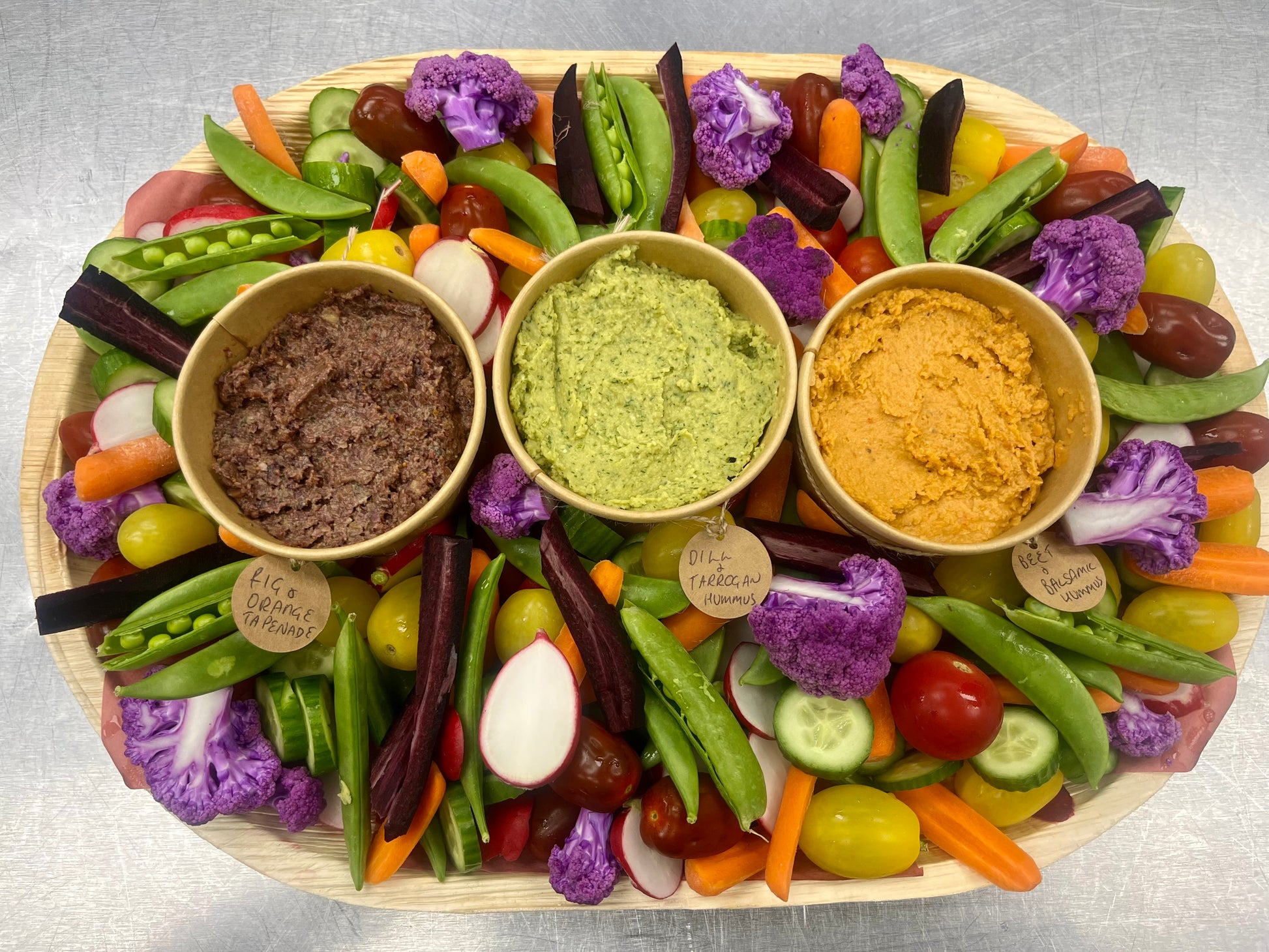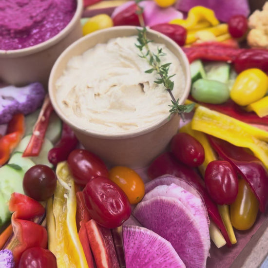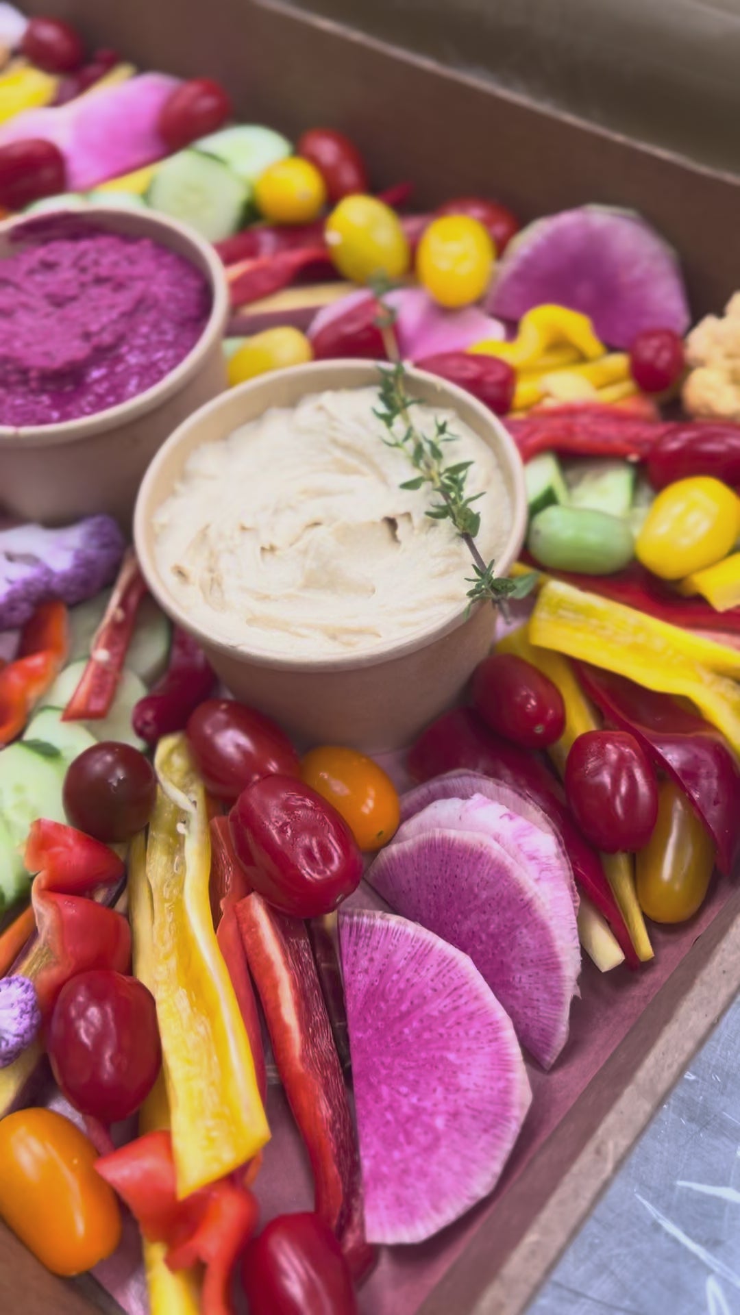 Three kinds of DF dip including delicious hummus from our friends at Bobali. A rainbow of fresh, seasonal veggies from the Farmers Market in season. Presented on a reusable, sustainable palm leaf board or compostable Kraft paper tray.
